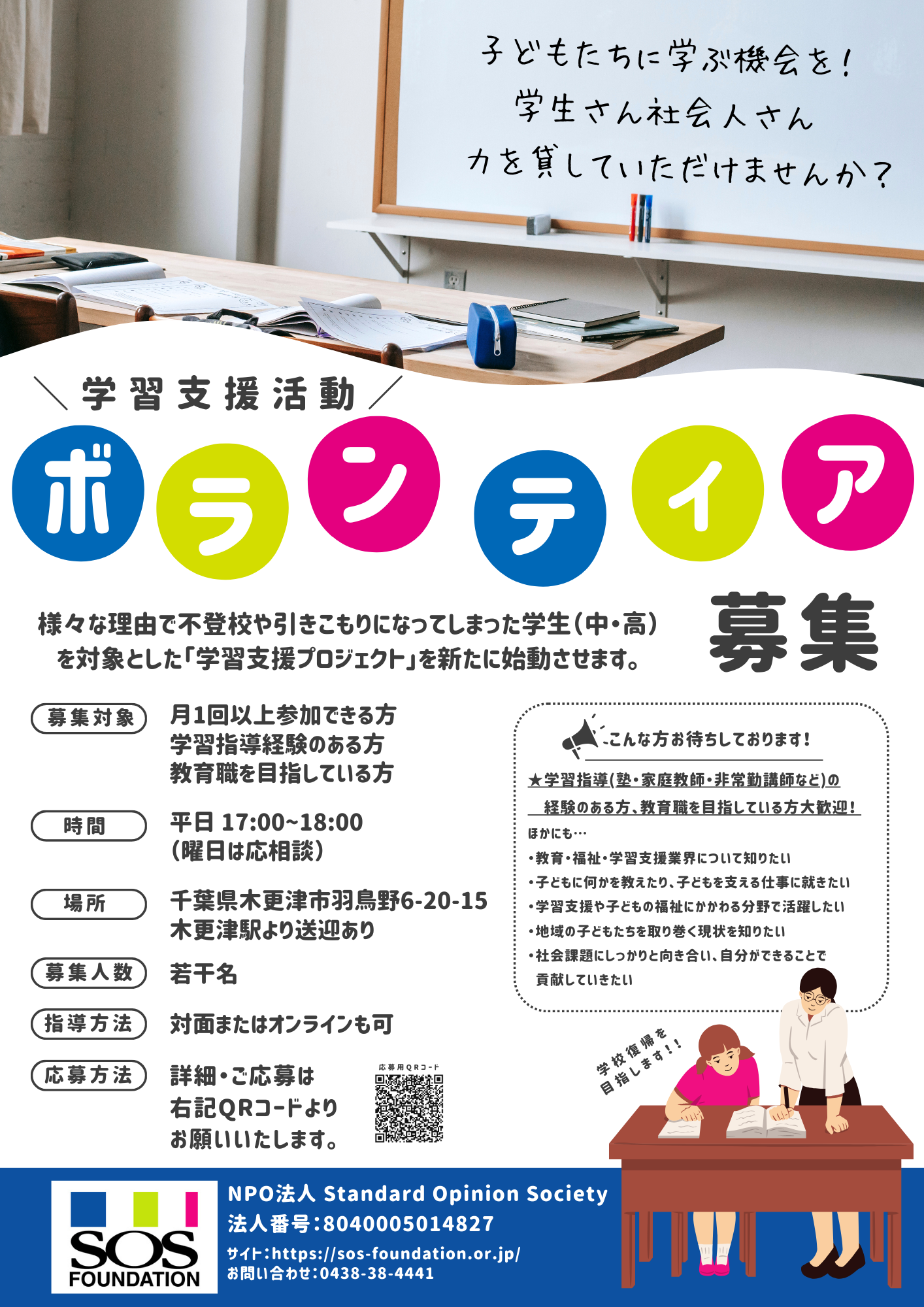 わたしたちSOSは、様々な理由で不登校や引きこもりになってしまった学生(中学生・高校生)を対象とした「学習支援プロジェクト」を新たに始動させます。